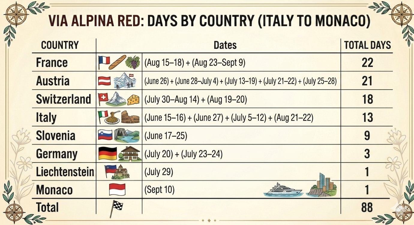 France is the biggest continuous stretch of the whole route. This is where we spend a long, uninterrupted block of time moving through the Alps without switching in and out of borders.